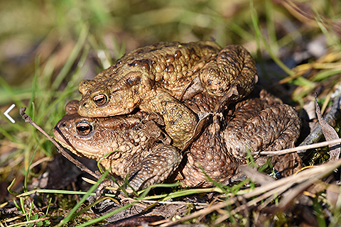 Die kleineren Erdkröten-Männchen lassen sich häufig von einem größeren Weibchen "huckepack" zum Laichgewässer tragen.